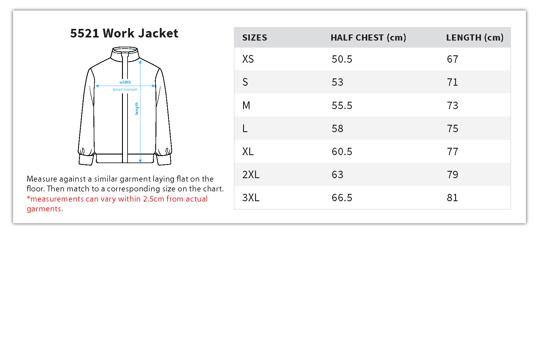 Construction: Collared jacket, two side pockets, snap dome to close, adjustable cuffs and hem