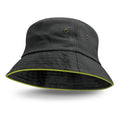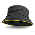 Premium cotton twill black bucket hat with coloured trim and a sweatband. The hat's material provides excellent UPF50 protection from the sun and is available in three sizes which will fit most people, including kids.