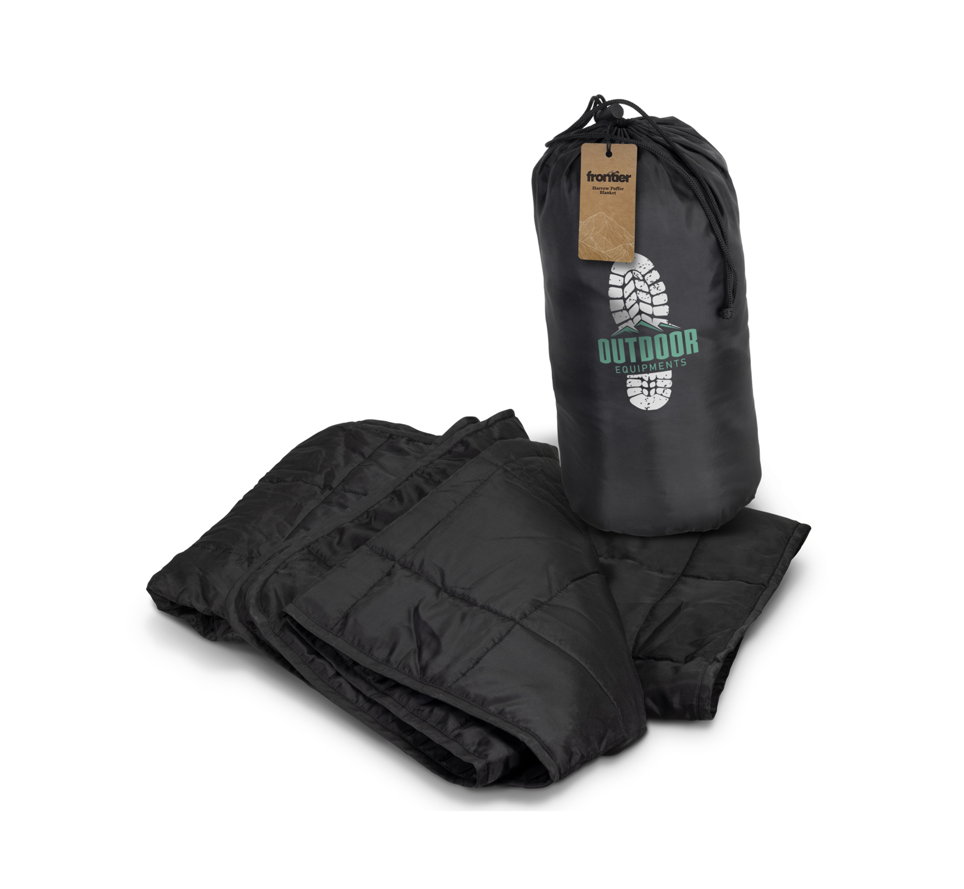 Versatile and cosy puffer blanket made from water-resistant 210T polyester with 150gsm foam fill, making it suitable for indoor and outdoor use. The 1250mm x 1500mm blanket has neat bias edging and is supplied in a drawstring polyester pouch with a carry handle. Presented with a Frontier branded hangtag.