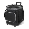 Large 24L trolley cooler bag with a two-stage pull up handle and robust dual wheels. It has thick PE foam insulation encased in a water-resistant PEVA inner liner and the outer construction is 600D polyester with decorative ripstop nylon trim. Other features include a zippered top closure, two large side pockets, a large zippered front pocket, woven carry handles with a Velcro cuff and trendy elastic lacing which is ideal for holding a sweater or light jacket.