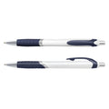 Retractable plastic ballpoint pen with a white barrel, a soft-touch grip and shiny chrome trim. It has a black or blue refill with 1200 metres of German manufactured Dokumental ink.