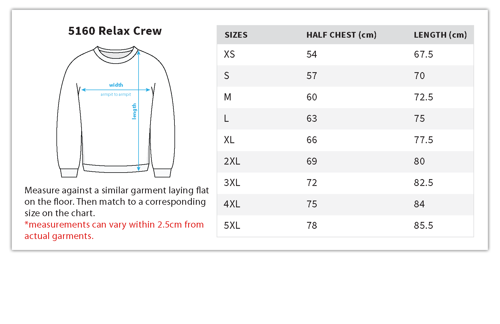 Construction: Pre-shrunk to minimise shrinkage, pullover crew, drop shoulder, crew neck, sleeve cuff ribbing.