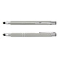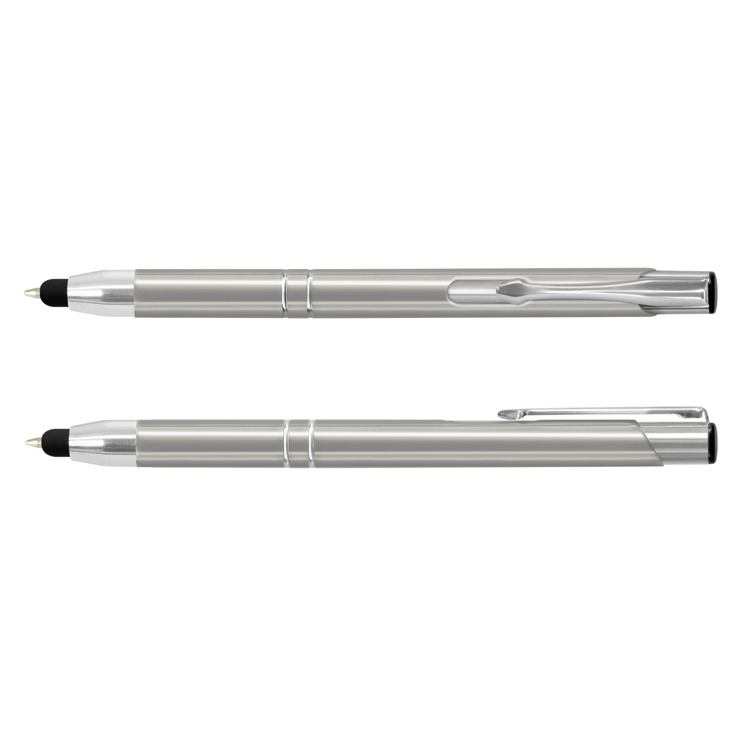 Retractable aluminium ball pen with an anodised barrel and shiny chrome accents. It has a stylus for use with touch screens and a black refill with 1000 metres of German manufactured Dokumental ink. The barrel laser engraves to an oxidised white colour.