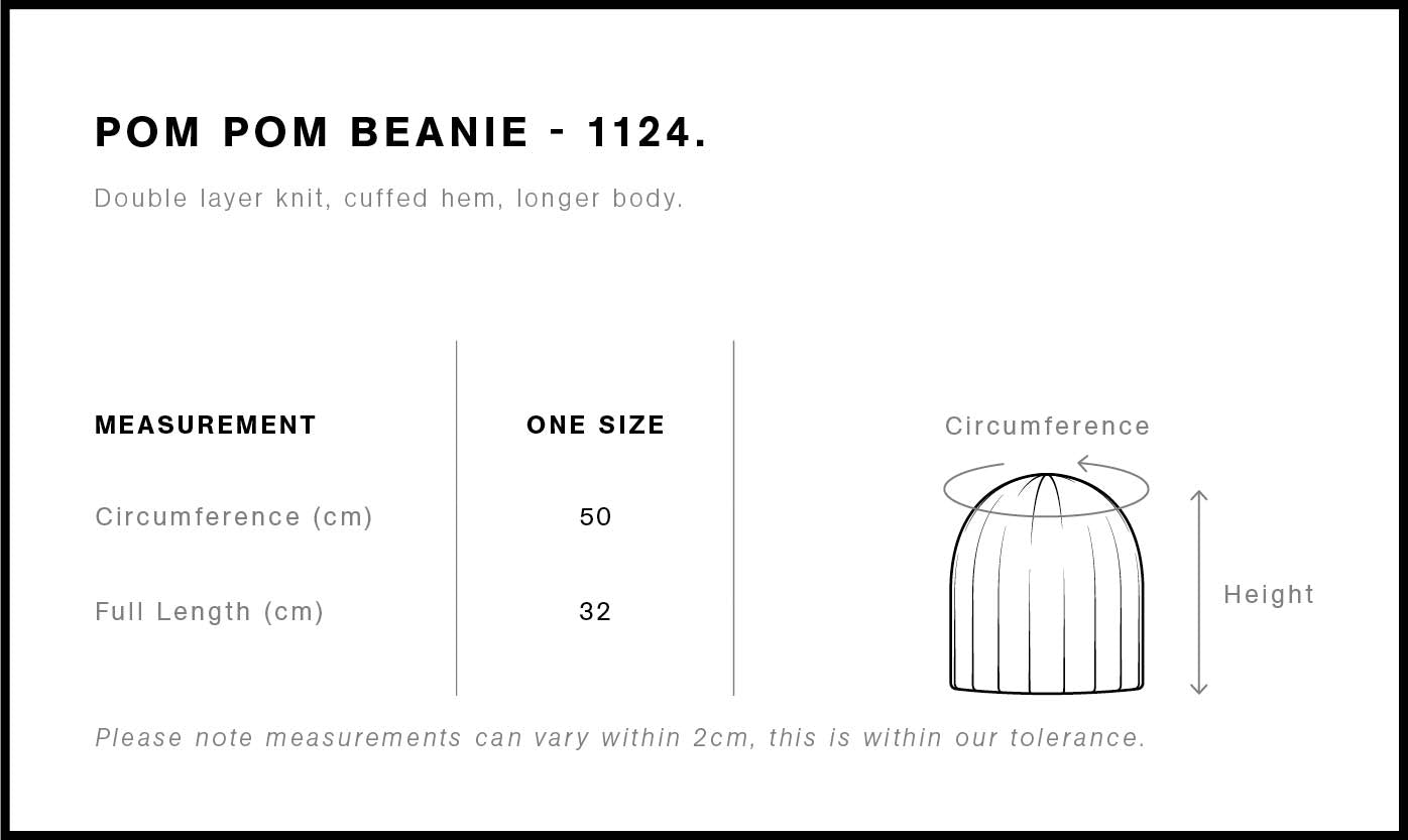 Construction: Relaxed style, tight knit, cuffed hem, longer body, tonal pompom attached, double layer knit