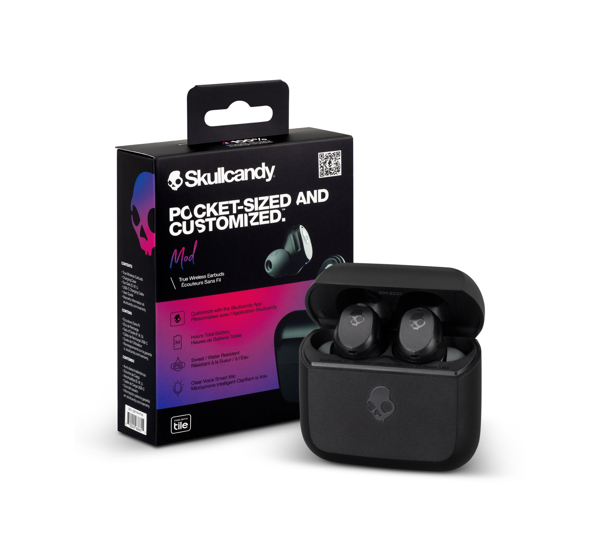 Skullcandy's most comfortable and compact earbuds, the Mod True Wireless Earbuds provide a high quality audio experience and are sweat, dust and water-resistant. Enjoy up to 34 hours of playback and connect seamlessly to multiple devices with multipoint pairing. With Rapid Charge, just a 10-minute charge provides four hours of playtime. The Skullcandy logo is positioned on the earbuds and case, and this product is presented in Skullcandy packaging. Please note the branding on the packaging is subject to change without notice, and this product cannot be supplied unbranded or without the Skullcandy branding.