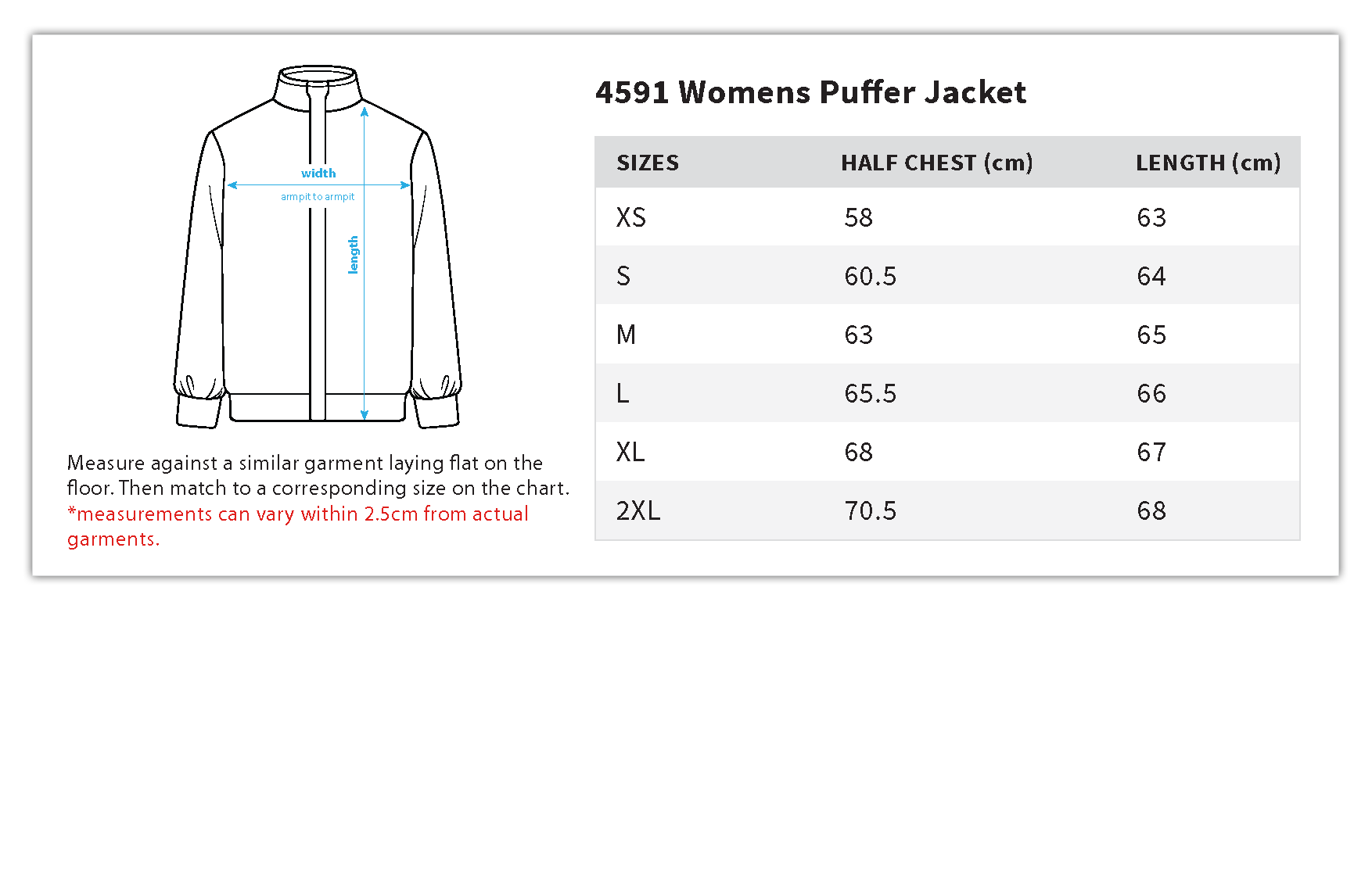 Construction: Stand collared, two side pockets, YKK zip to close, cinch cord at waist, internal chest pocket, elastic cuffs on sleeves, water & wind resistant. Invisible lining access zip to assist with branding. RDS certified down & feathers.